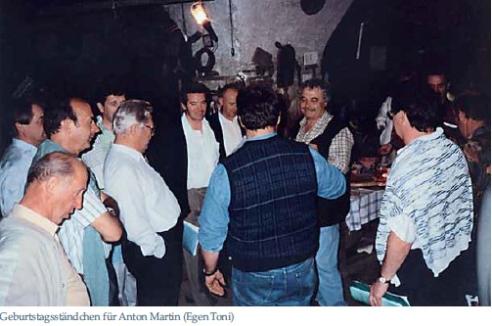 Im Juni 1993 hatte der Männerchor Gelegenheit, seinem Gönner und Förderer Anton Martin (Egen Toni) ein Geburtstagsständchen darzubringen. Toni war ein begeisterter Fan des Männerchores. Am 11. Juni bot sich die Gelegenheit, dem Toni im Egen Keller zu seinem Geburtstag zu gratulieren.